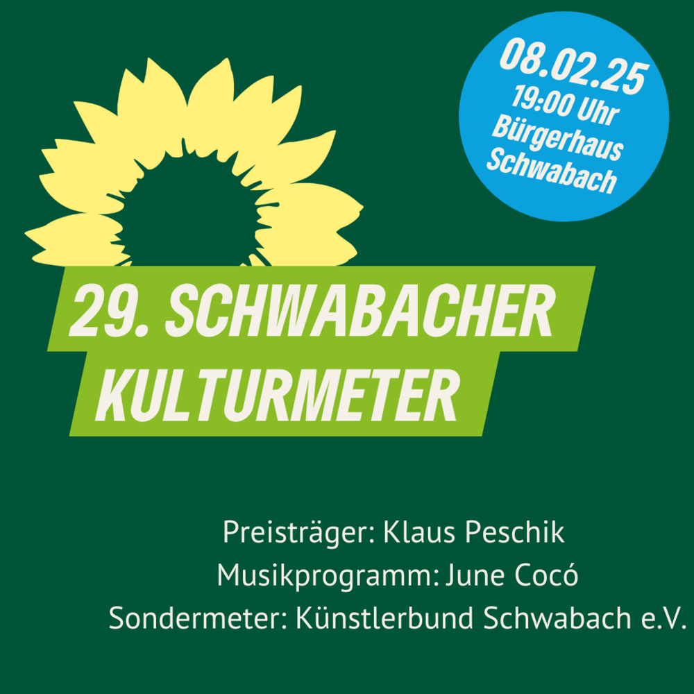 Am Samstag, 08. Februar 2025, um 19:00 Uhr verleihen die Schwabacher Grünen zum 29. Mal den Kulturmeter im Bürgerhaus Schwabach.