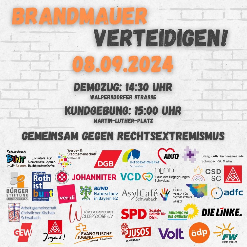 wir möchten Euch herzlich einladen, an der Demonstration „Brandmauer verteidigen! Gemeinsam gegen Rechtsextremismus“ am 08.09.2024 in Schwabach teilzunehmen. Diese wichtige Demonstration, organisiert von der Initiative für Demokratie gegen Rechtsextremismus Schwabach, bietet uns die Möglichkeit, ein starkes Zeichen gegen den wachsenden Rechtsextremismus und für den Schutz unserer Demokratie zu setzen. Besonders in Anbetracht der besorgniserregenden Entwicklungen in den östlichen Bundesländern ist unser Engagement wichtiger denn je.