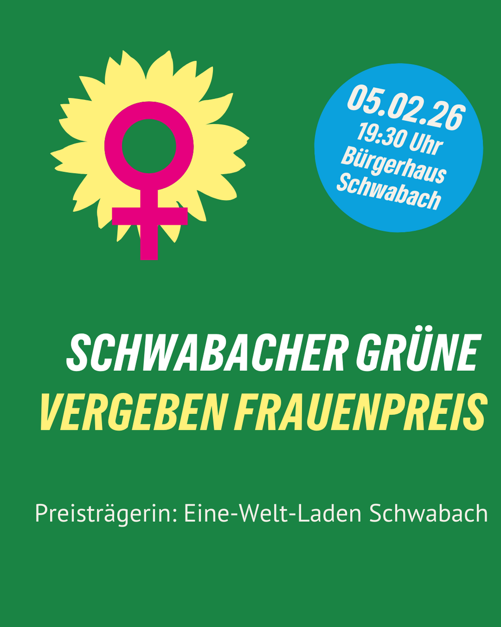 Die Verleihung des Frauenpreises des Kreisverbands Schwabach von Bündnis 90/Die Grünen findet am Donnerstag, 5. Februar 2026, ab 19:30 Uhr im Bürgerhaus Schwabach, Königsplatz 33A, statt.