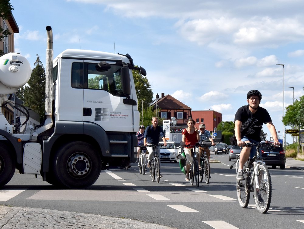 Zu Beginn der Veranstaltung radelten Interessierte aus ADFC, VCD und den Grünen zusammen mit Dr. Büchler vom Bahnhof über die Weißenburger und Fürther Straße zum ehemaligen Niehoff-Gelände. Auf der vierspurigen Straße zur Rushhour war dies kein Vergnügen. Wie würde sich eine
