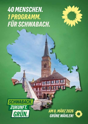 Für die Kommunalwahl 2026 legen wir ein Programm vor, das Ökologie und Ökonomie zusammen denkt und unsere Stadt zukunftsfähig macht. Wir treten dafür ein, dass Wohnraum bezahlbar bleibt, Kinder und Jugendliche gute Chancen haben, Mobilität sicher und klimafreundlich funktioniert und Schwabach wirtschaftlich stark bleibt. Dabei wollen wir das soziale Miteinander stärken und Kultur unterstützen, die Menschen verbindet.
